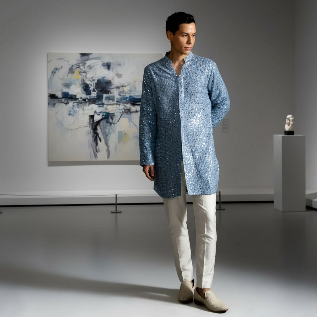 Elevate your traditional wardrobe with The Complete Blue Sequin Look. The shimmering blue sequin kurta brings festive sparkle, perfectly balanced by crisp white pants for a fresh, elegant contrast. Paired with classic white jutti, this ensemble ensures you stand out with grace and style at every celebration. Embrace effortless sophistication and make every occasion memorable.