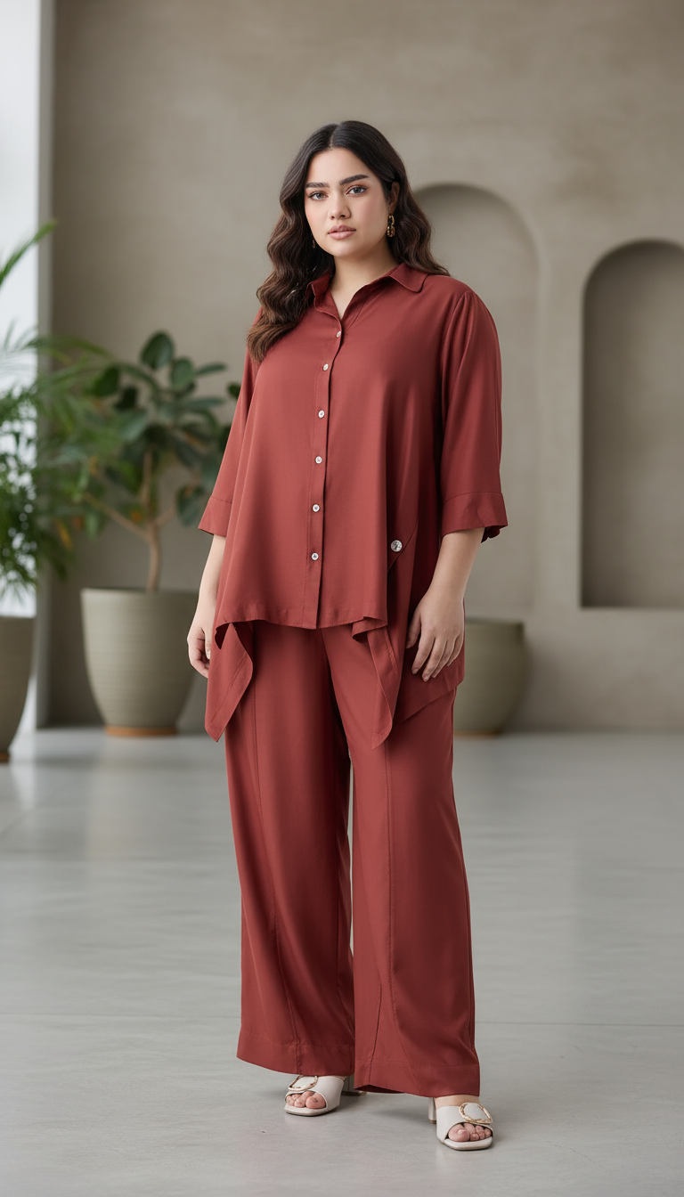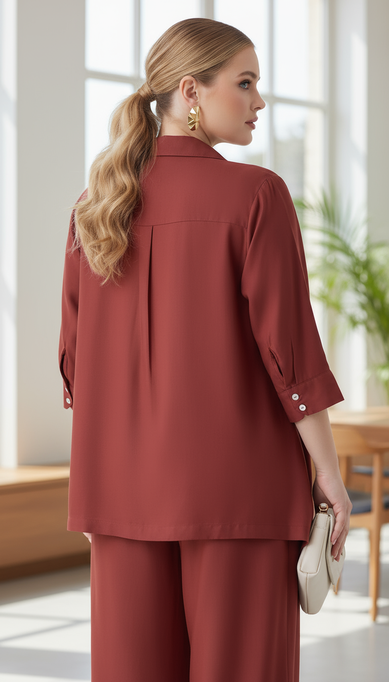 Elevate your everyday wardrobe with this rust shirt—a masterclass in understated elegance. The structured collar and three-quarter sleeves provide polished definition, while the flowing fabric drapes with effortless grace. What truly sets this piece apart is the asymmetric hem, a bold design detail that transforms a classic silhouette into something distinctly modern. Perfect for those who appreciate refined style without compromising on contemporary flair, this shirt seamlessly transitions from office to evening, proving that sophistication never goes out of style.